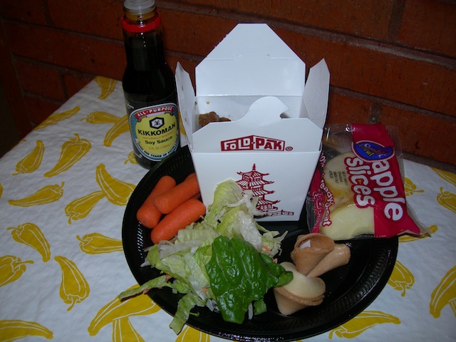 Tip #3: KEEP BACKGROUND SIMPLE. Help the viewer focus on the food by eliminating distracting background patterns. One of the best backgrounds is a clean stainless kitchen counter or cafeteria table. While the meal below has some great options, there are too many districting patterns in the background, plus we cannot see what food is in the box. There is also no reason to include the bottle of soy sauce – a carton or bottle of milk would be much better.