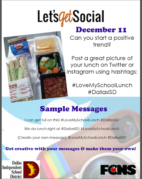The Marketing Group at Dallas ISD Food and Child Nutrition Services went out on limb – and there was some fruit there! There was also some veggies, a Hummus Plate and most unexpectedly, a #RealSchool Food music video! They created the hashtag #LoveMySchoolLunch and promoted it a selected number of “Social Supervisor Stars” for a social media campaign on Thursday, December 11th, 2014, using this flyer.
